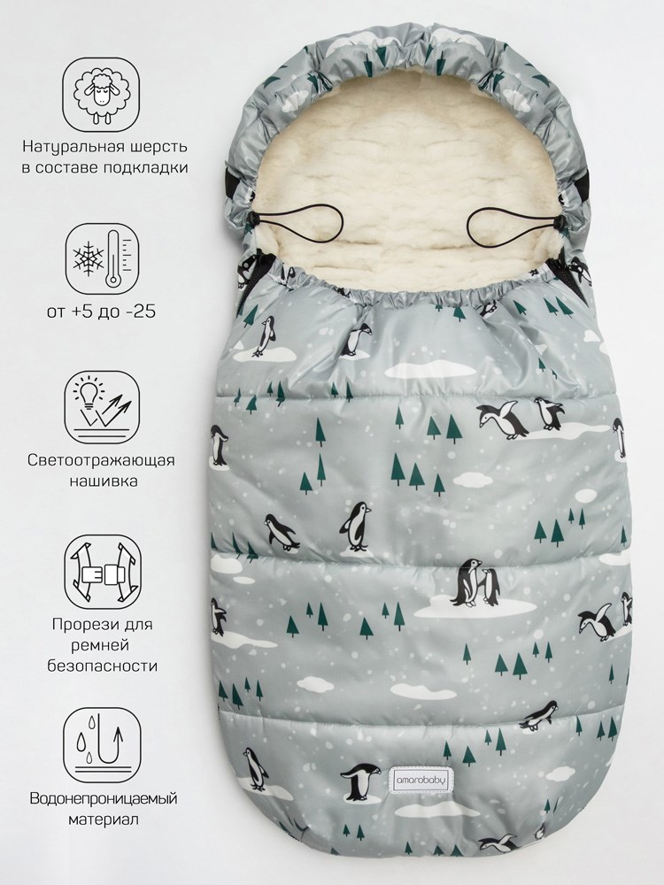 Зимний меховой конверт Amarobaby Travel Пингвины отлично подходит для прогулок с ребенком холодное время года.