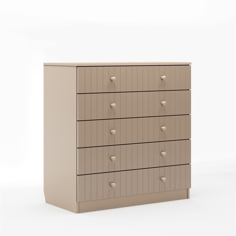 • Фасады изготовлены из экологически чистого материала и окрашены износостойкой безопасной краской. Вертикальная фрезеровка придает комоду современный внешний вид и дополнительный шарм.